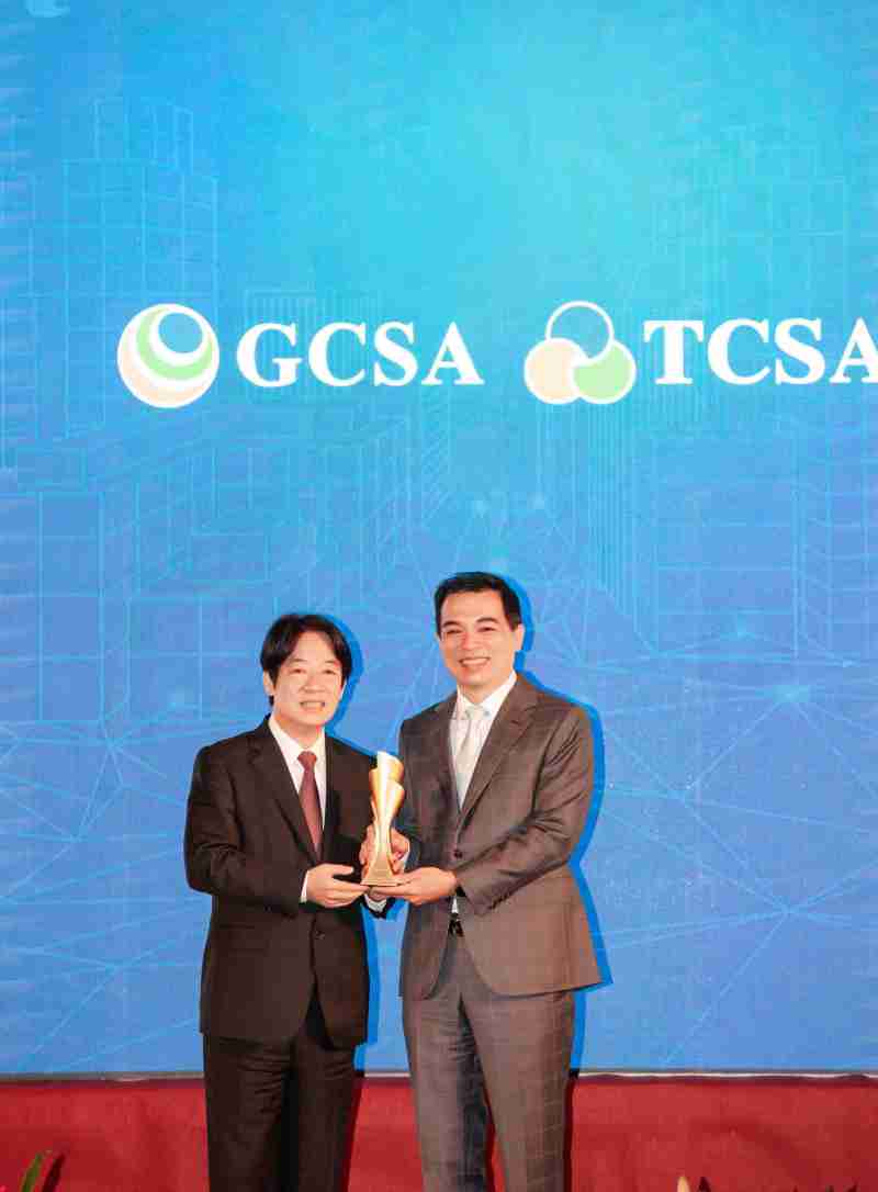 达全方位永续表现获全球永续奖及台湾永续奖肯定,,,由副总统赖清德颁奖 (左),,888.BY集团电子游戏总经理柯富仁 (右) 代表领奖